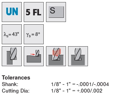 The calculated geometry of the Design-Rite 5 Flute, 45° helix end mill has a stronger core for heavier cuts that run incredibly smooth. Designed to run specifically in Exotic Materials, Stainless Steel, Carbon Steel, Titanium, Inconel, etc. where you will achieve improved finishes at higher speeds. These tools come standard with our high heat resistance Aluminum Titanium Nitride (AlTiN) Coating.